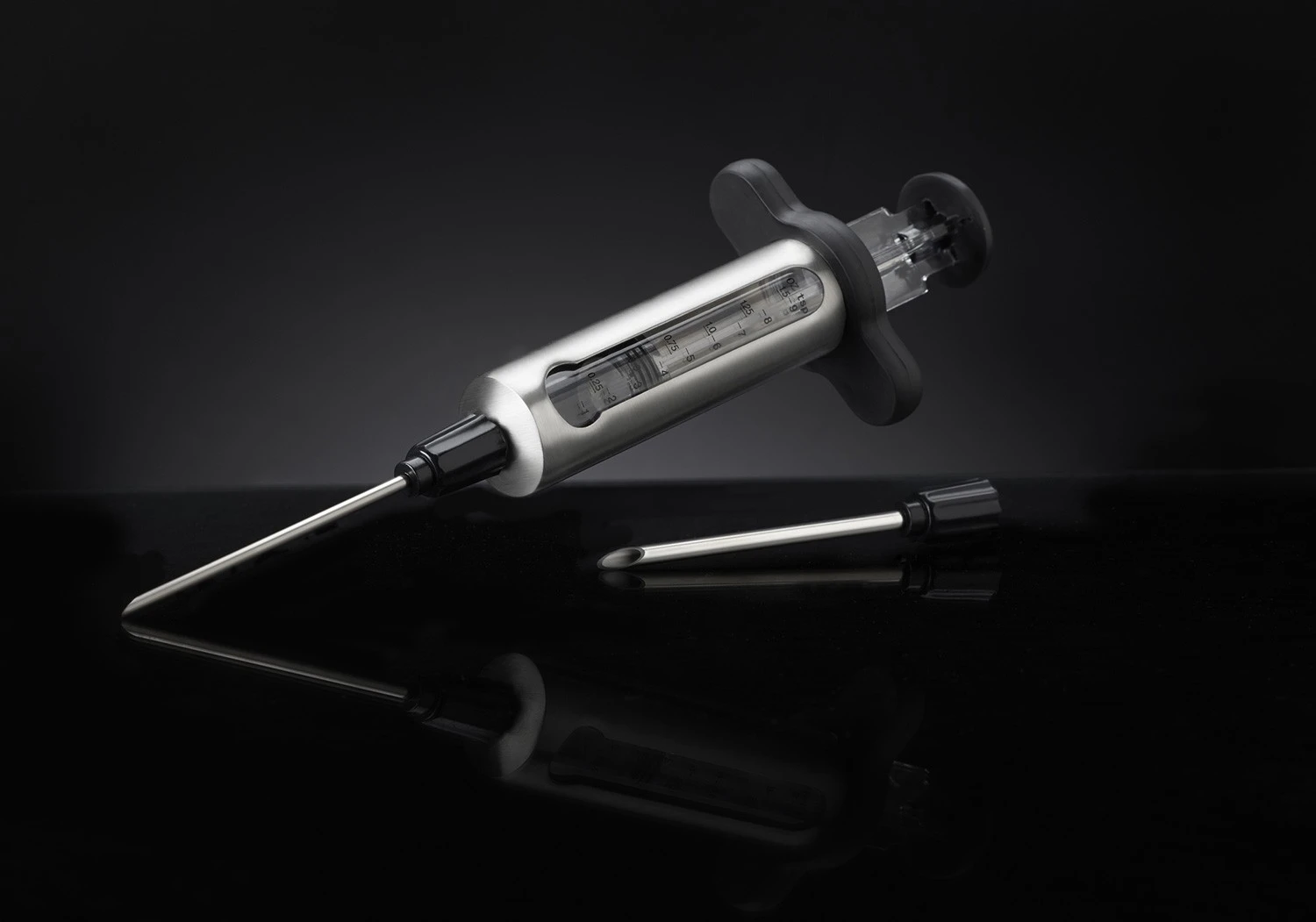 Im Set werden zwei Injektionsnadeln in verschiedenen Durchmessern mitgeliefert. Die dünnere Nadel eignet sich perfekt für dünnflüssige Marinaden und Saucen. Auch zerronnene Butter oder Wein lässt sich mit ihr hervorragend in das Grillgut injizieren. Die Nadel mit dem größeren Durchmesser ist für Marinaden geeignet, die kleingehackte Bestandteile wie zum Beispiel Knoblauch oder Kräuter beinhalten.