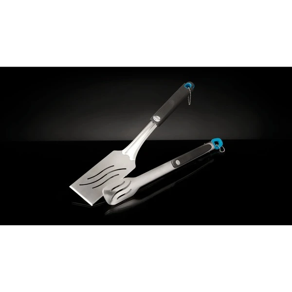Das 2-teilige Grillbesteck-Set 70032 von Napoleon enthält Pfannenwender und Zange aus Edelstahl. Die ergonomischen Griffe haben eine Soft-Touch-Grip Oberfläche. Der extra lange Pfannenwender eignet sich ideal für Steaks und anderes größeres Grillgut. Der Pfannenwender hat einen Wellenschliff und einen scharfen Rand.Art.-Nr.: 1496404