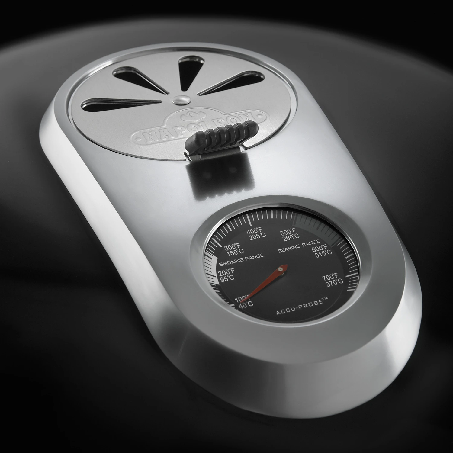 Das Deckelthermometer ACCU PROBE™ zeigt Ihnen zuverlässig die Garraumtemperatur an. Mit einer Skala von 40°C bis 370°C überwacht es den gesamten Temperaturbereich des Geräts.
