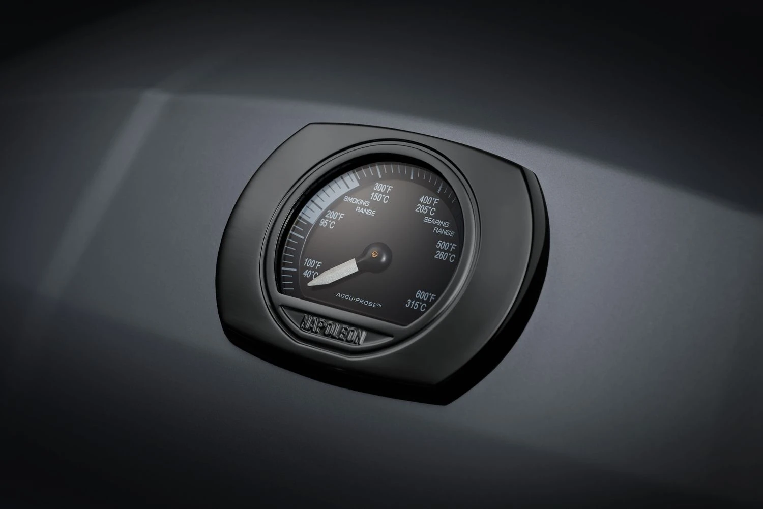Das Deckelthermometer ACCU PROBE™ zeigt Ihnen zuverlässig die Garraumtemperatur an. Mit einer Skala von 40°C bis 370°C überwacht es den gesamten Temperaturbereich des Geräts.