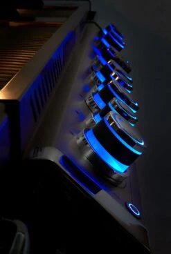 Unter dem rechten Deckel sorgen zwei Infrarot-Keramikbrenner – die Sizzle Zone – für ein wahres Höllenfeuer. Diese erreichen im Betrieb bis zu 980°C und sind somit ideal dazu geeignet, Steaks und anderes Fleisch extrem scharf anzubraten. Mittig bietet ein weiterer Warmhaltebrenner besonderen Komfort für bereits fertig gegartes Grillgut. Viele geniale Extras wie die mehrfarbige Drehreglerbeleuchtung sowie eine Bodenprojektion mit Bewegungsmelder lassen den Prestige Pro 825 zum echten Luxus Grill für die Outdoor Küche werden.